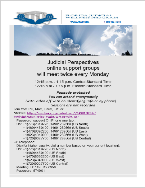 Call the Florida Judicial Wellness Program Confidential Hotline at 888-972-4040 for with any personal or confidential matters for which you may need immediate attention or assistance.